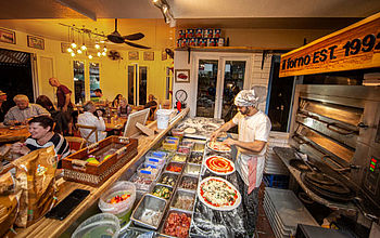 Enjoy our delicious thin crust pizzas at home with our extensive takeaway menu, or eat in to enjoy the relaxed ambiance of palm-lined shores and gently crashing waves against a mountainous backdrop.